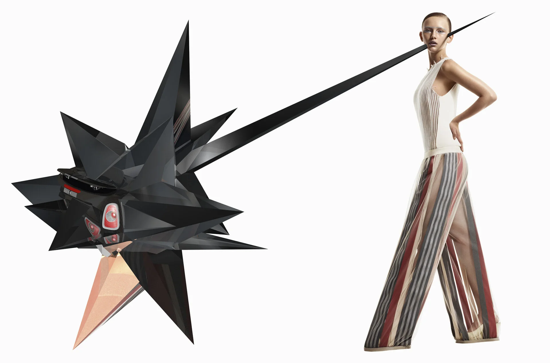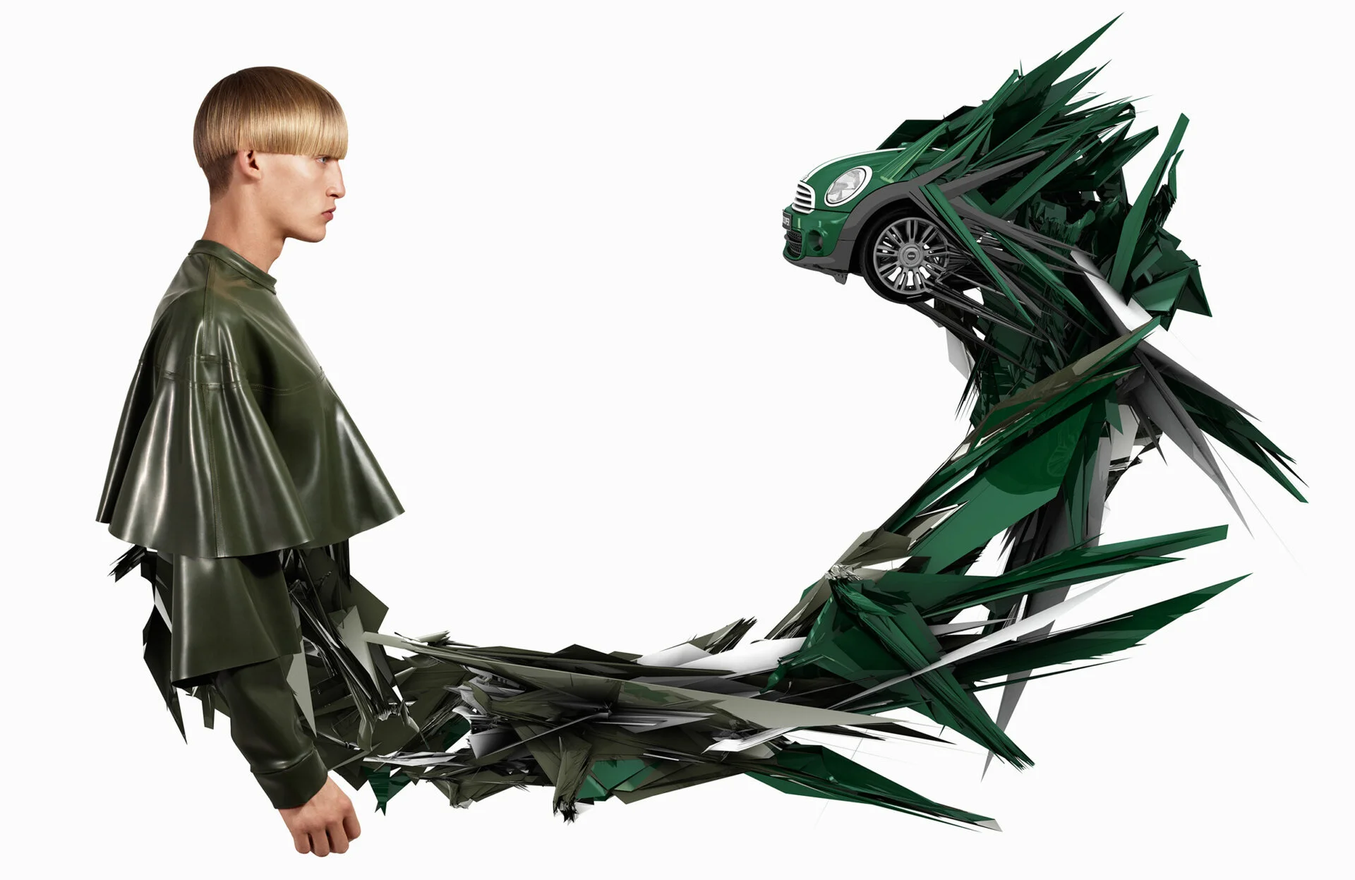 A fashion campaign for Mini in collaboration with UK’s Dazed magazine. Six up-and-coming fashion designers were commissioned to share their vision of contemporary urban lifestyles. At the same time, we experimented with the MINI Coupe’s original factory 3D CAD files. Our goal was to bring the fashion shots and the car’s virtual volumes seamlessly together into the same world and position the car at the forefront of avant-garde design.